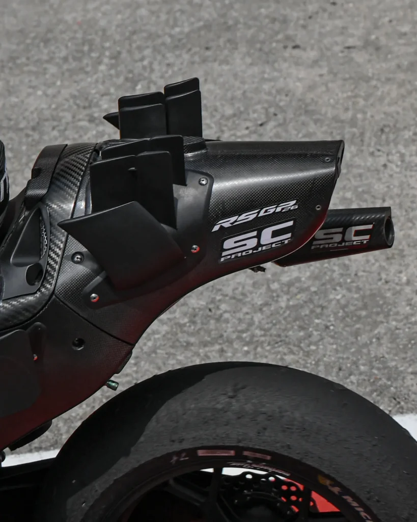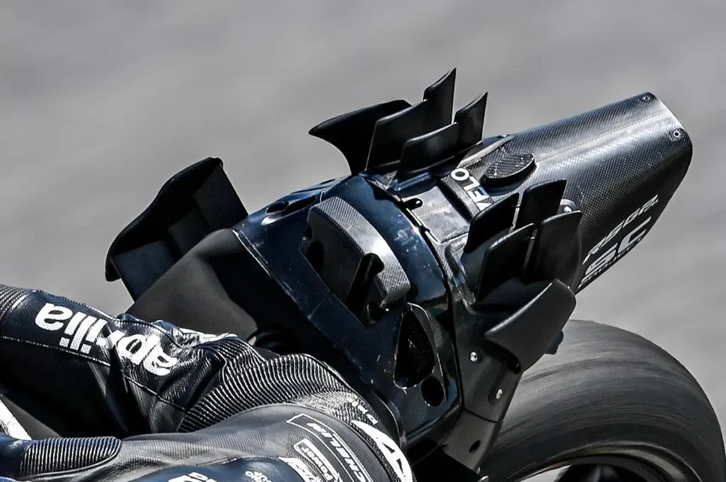 最近アプリリアがリアウィングレットはバイクの安定性、姿勢制御、そしてコーナー脱出時のトラクションを最適化するために取り付けられていると思っていたら、ひそかに後方ライダーの気流を悪化させる効果も利用できることにも効果があることがわかり、このゴジラの背中似たいなギザギザウィングをテストしたみたいですね。